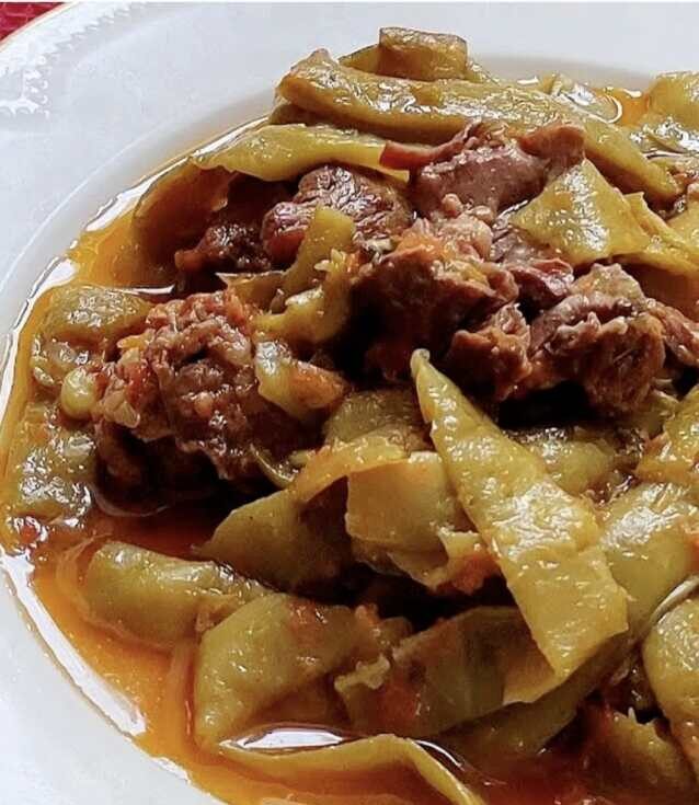 This hearty recipe features tender pieces of veal slow-cooked in a rich tomato sauce with fresh green beans, infused with olive oil, garlic, and aromatic herbs like oregano and bay leaves.