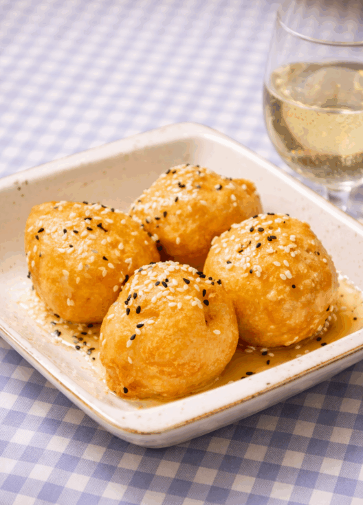 These loukoumades are not the classic syrup-soaked version.They are lighter, more elegant, and built around balance. Crispy on the outside, warm and airy inside, then gently filled with a soft, creamy Greek cheese. Finished with golden honey and toasted sesame seeds, they sit perfectly between sweet and savory. This is the kind of dish you find in ...