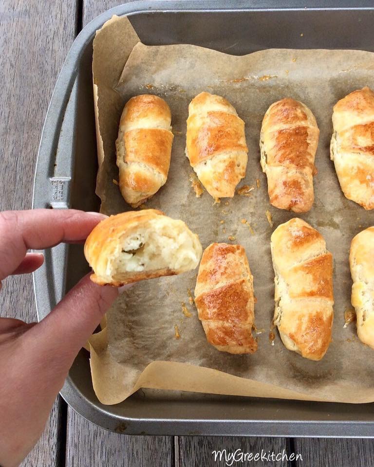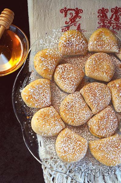 A simple yeast rolled in the machine -for easier procedure- fresh local mizithra and served with honey or powdered sugar and cinnamon.