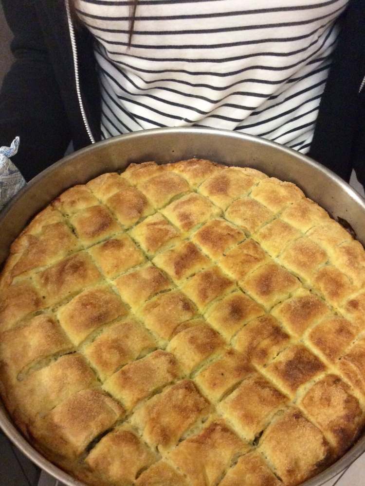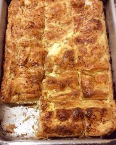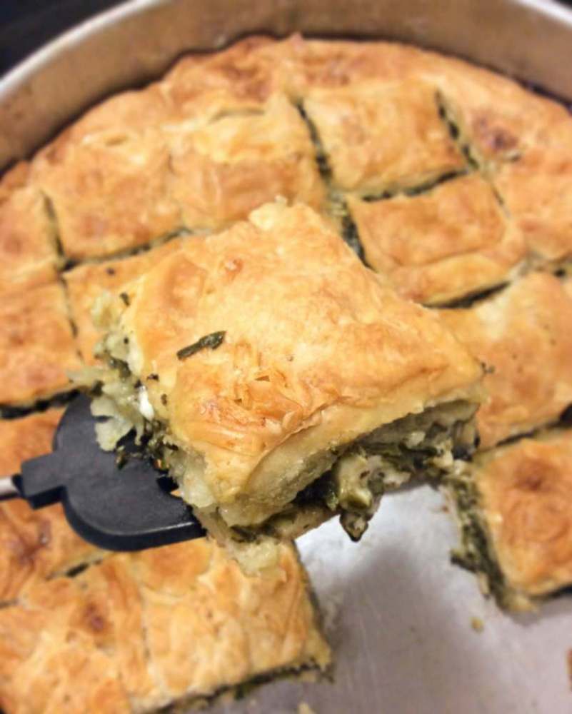 Greek pies are made in a large pan ( tapsi) and cut into individual portions after baking. The individual form is sold in bakeries throughout Greece, where it is a popular breakfast and snack.