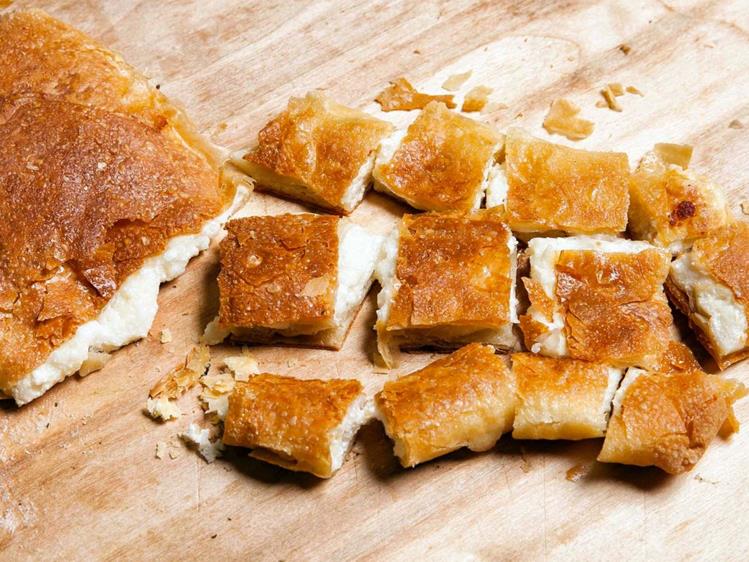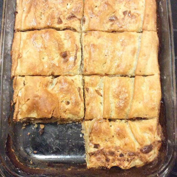 Bougatsa is a Greek breakfast pastry consisting of either semolina custard, cheese, or minced meat filling between layers of phyllo.