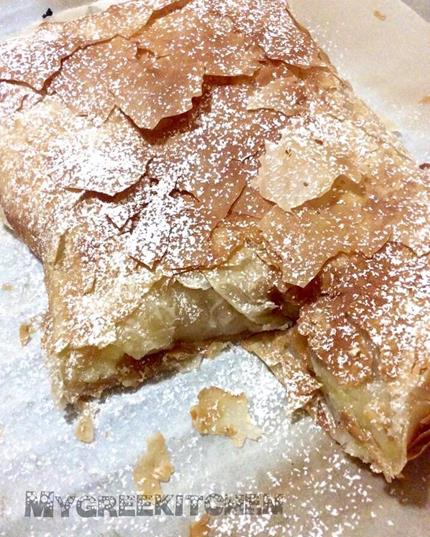 Greek bougatsa is prepared from phyllo dough wrapped around a filling. After it is baked, it is cut into serving pieces and served hot. If the filling is semolina custard, then the pastry may be lightly dusted with powdered sugar and/or cinnamon.