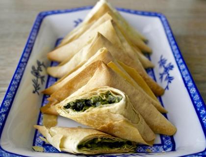 The traditional filling comprises chopped spinach, feta cheese, onions or scallions, egg, and seasoning.