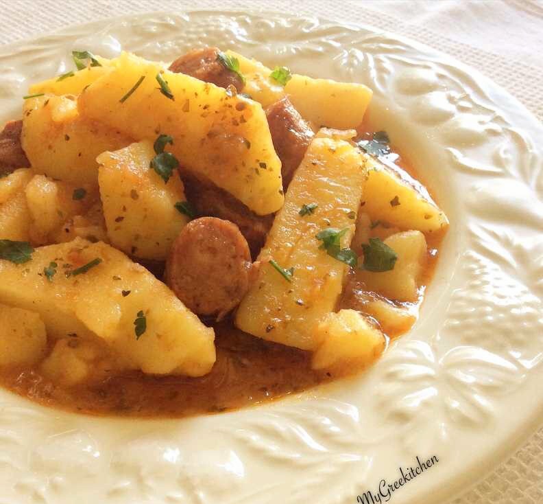 This dish is simple yet full of flavor. The potatoes slowly simmer in a rich tomato broth, absorbing the garlic, onion, and olive oil until they’re melt-in-your-mouth tender. The addition of loukaniko gives it a smoky depth that makes it even more irresistible.