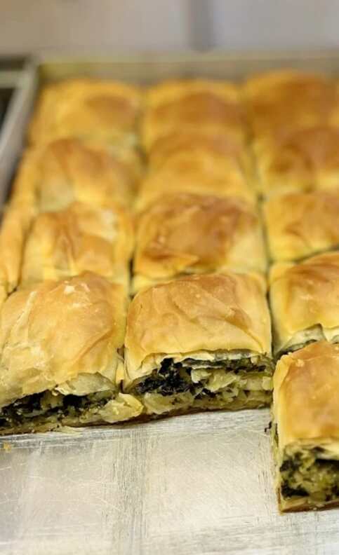 The traditional filling comprises chopped spinach, feta cheese, onions or scallions, egg, and seasoning.