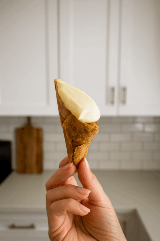 We crumple a piece of non-stick paper to the size of a small ball and place it inside the triangle, in order to create a cavity that will hold its shape during baking and will be filled later with cream.