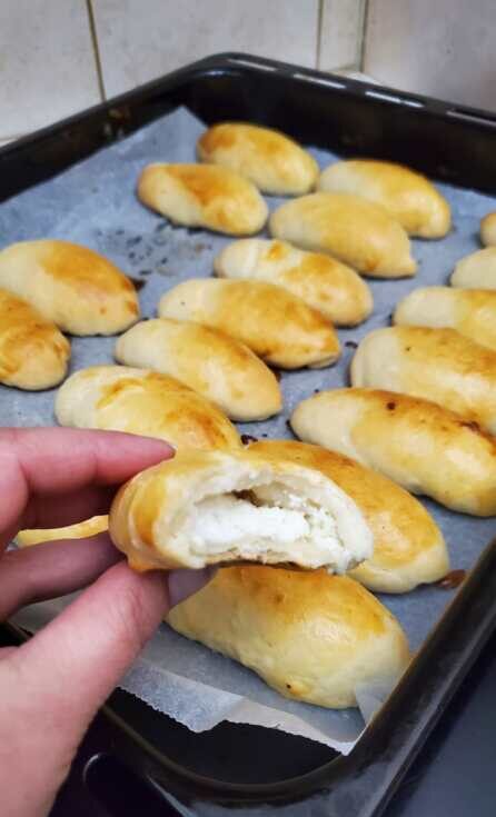 Then divide the dough into balls and open each ball into a leaf. Place a crumbled feta slice on half of the sheet and close.